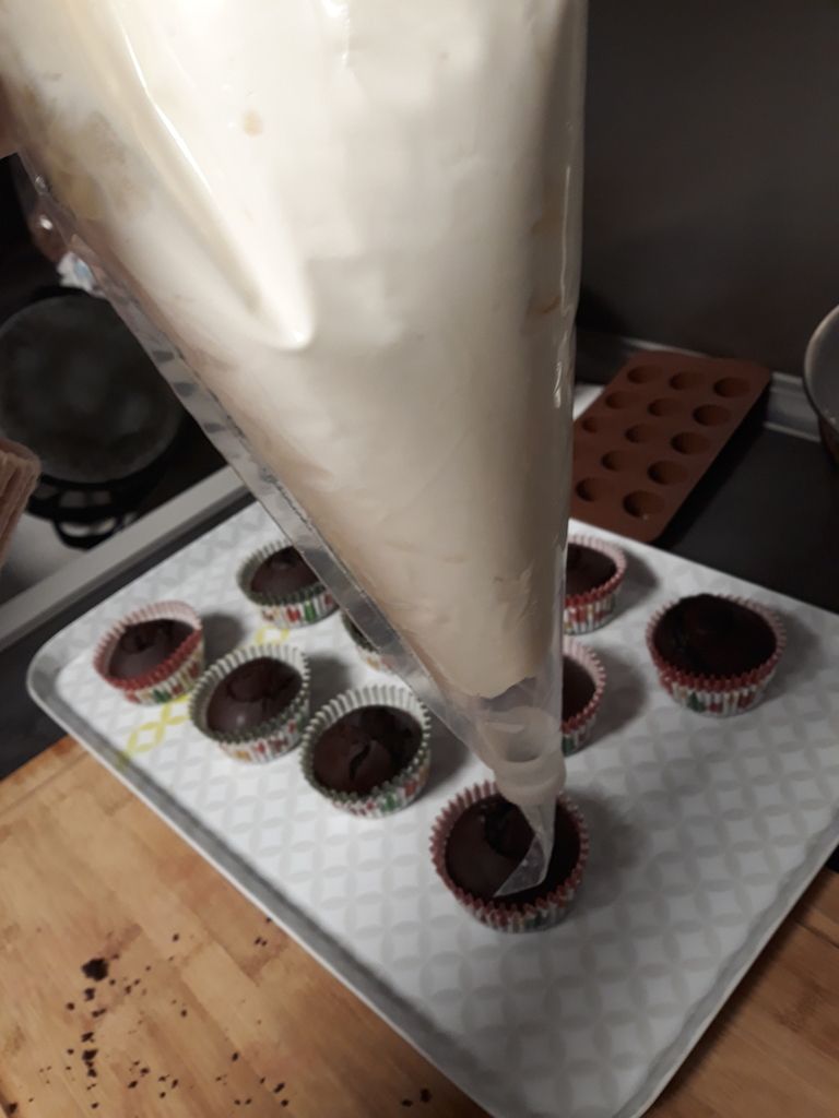 Ensuite, on met la crème dans une poche à douille et on décore les cupcakes en partant de l'extérieur vers l'intérieur de façon circulaire.