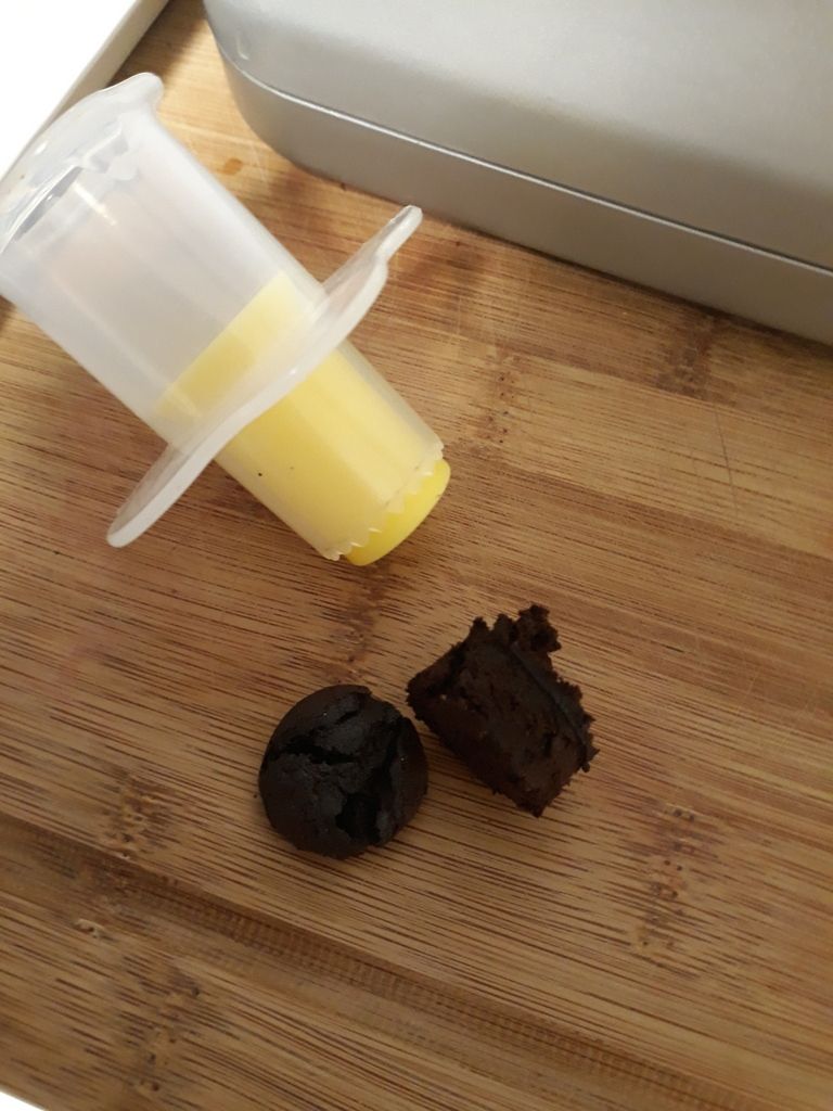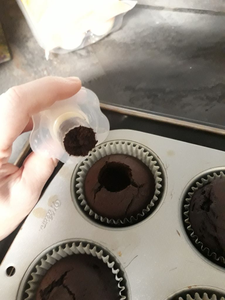 Personnellement, j'ai un petit ustensile qui me permet de découper un trou dans le cupcake... et une fois de la confiture de cerise déposée à l'intérieur, je recoupe un peu de la partie du cupcake précédemment enlevé et le repose pour reboucher le trou !!!